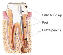 3) After the space is cleaned and shaped, the endodontist fills the root canals with a biocompatible material, usually a rubber-like material called “gutta-percha”. The gutta-percha is placed with an adhesive cement to ensure complete sealing of the root canals. In most cases, temporary filling is placed to close the opening. The temporary filling will be removed by your dentist before the tooth is restored.