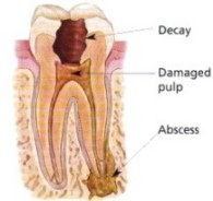 Endodontic treatment is necessary when the pulp becomes inflamed or infected. The inflammation or infection can have a variety of causes: deep decay, repeated dental procedures on the tooth, or a crack or chip in the tooth. In addition, a blow to a tooth may cause pulp damage even if the tooth has no visible chips or cracks. If pulp inflammation or infection is left untreated, it can cause pain or lead to an abscess. Signs of pulp damage include pain, prolonged sensitivity to heat or cold, discoloration of the tooth, and swelling and tenderness in the nearby gums. Sometimes, there are no symptoms.