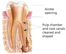 2) The endodontist makes an opening in the crown of the tooth. Very small instruments are used to clean the pulp from the pulp chamber and root canals and to shape the space for filling.